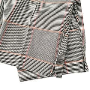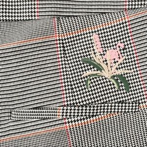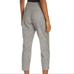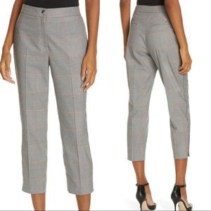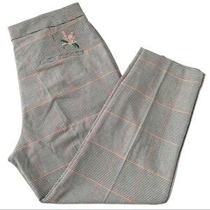 Ted Baker London DARCEYT heritage plaid cropped trousers pants light grey black/white mini houndstooth red pinstripe check print high rise high waist front pockets rear welt pockets embroidered flamingo floral appliqué zip/button closure tailored fit relaxed through leg notched side split ankle hem stretch-woven suiting fabric modern contemporary versatile career workwear