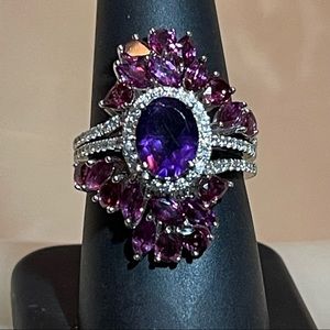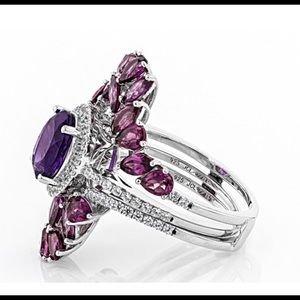 1.45ct 9x7mm Purple African Amethyst With 3.60ctw 2.5-5mm Rhodolite And 0.53ctw 1.20mm White Zircon, Rhodium Over Sterling Silver Ring Set of 2. With Ring Guard. Like new! See pics as part of description and measurements