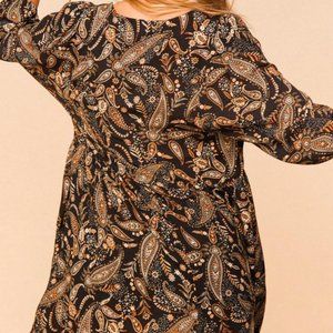 We are bewitched by this beautiful boho paisley print dress!! It features a square neck, woven fabric, and puff, bubble sleeves. The print is done in a golden color on a black background. It has pockets and a comfortable, loose fit. *the size large left does not have a size tag but measures a large.