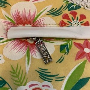 Cute vintage handbag with yellow floral print and white leather wrapped handles. One outside zipper compartment and multiple inside compartments. Approximate size is bottom 10” x top 16” x 9” x 4”. Never used. Great condition.