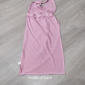 Faux wrap skirt creates a high left leg slit, deep v, halter neck, elastic band in back, open back, light pastel pink slinky soft stretchy thin jersey midi dress. New, never worn, no flaws, measurements in photos, extent of stretch demonstrated in video. Ships in a day from my smoke-free pet-free home.