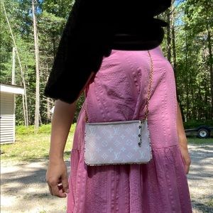 I am selling this limited edition LV double zip pochette. This is authentic and was in the summer of 2019. Checked photos for details. The inside is dirty but you can have it spa. I should a flaws on the inside too.