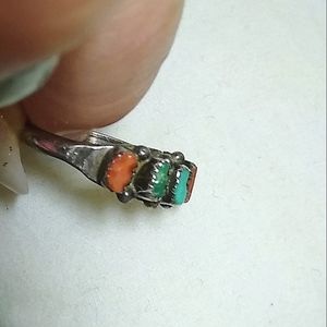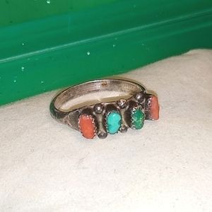 Shown in it's original aged patina, this Silver ring has different colored chunks of turquoise and coral stones .