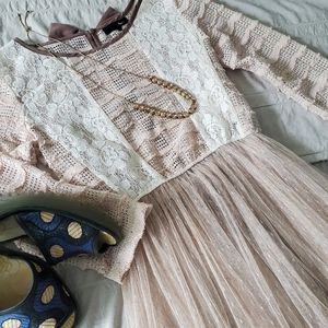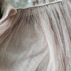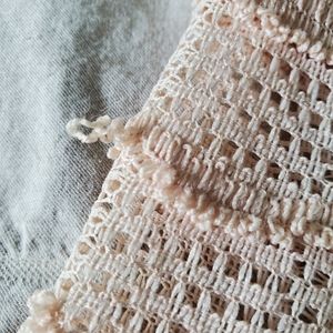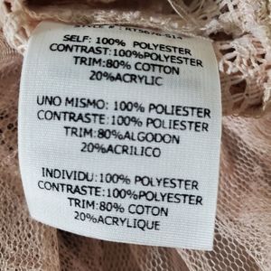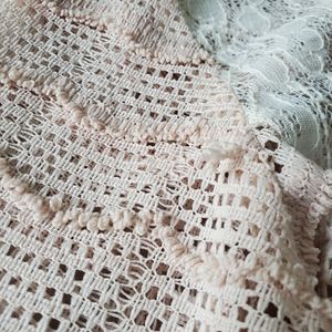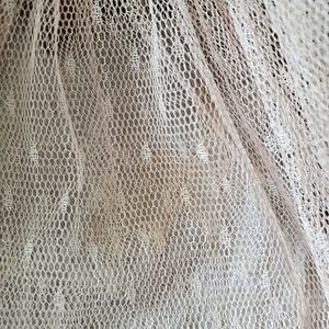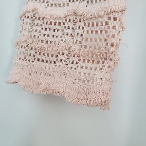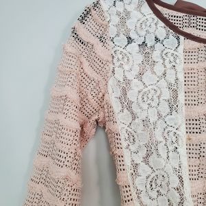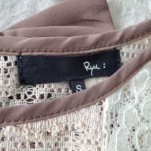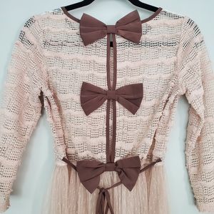 Ryu Lace and Open Knit Top. STunning top w/ interest details. The back is highlighted w/ three bows and a slender tie. Good used condition. I notice a few pulled threads although the are hard to tell from the looped raw look on the knit. Additionally there is a darkened area on the swiss dot overlay below the waist. See the last three pics for this section. About the size of two separate quarters. Not noticeable when worn. I wasn't aware of it until photographing.