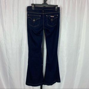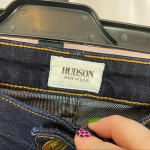 Hudson wide leg flare jeans, size 26. Very dark wash. Button flap back pockets. Small area on bottom of one leg where it looks like dye didn't hit, shown in photo.