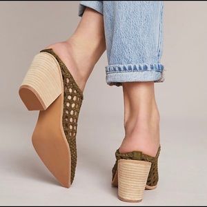 Jeffrey Campbell moss green Leone Mules. Great condition. Love the open weave Heels are 3"stacked leather. Insole and sole is leather. Woven upper leather.