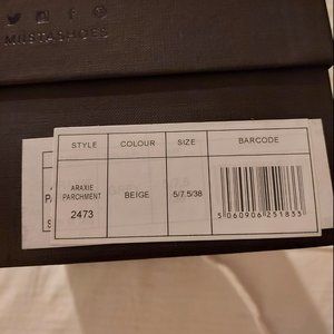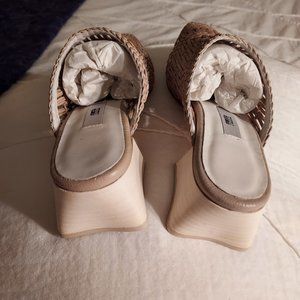 Brand new in original box. The perfect summer mule! Miista handwoven Araxie mule in parchment with a super cool architectural heel. A beautiful neutral that goes with everything (I've seen it described as light grey but I think it is much more of a taupe/tan). Size 38, which is about a 7.5. Listed as new with tags because in original packaging.