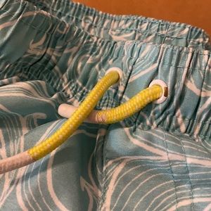 Aside from the wear on the drawstring rivet (pictured) and the name written on the waist band, these cute swim shorts show no signs of wear.