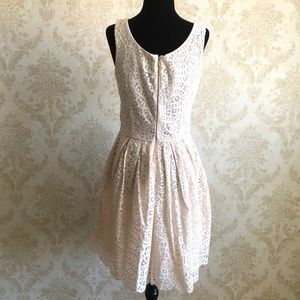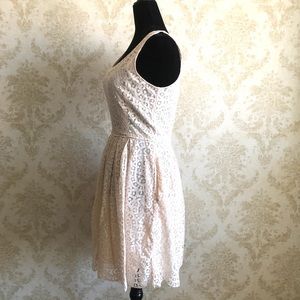 Excellent pre owned condition cream colour overlay lace fully lined sleeveless pleated waist back zipper closure 2 side pockets scallop edge bottom hem dress