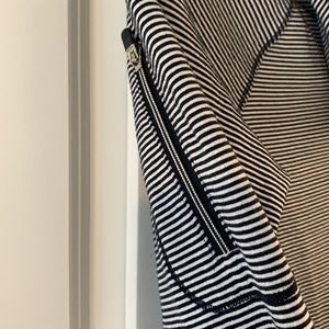 Navy and white striped with thumb holes. Has giant front pocket with zippers and one arm pocket. Small pilling which is showed in picture