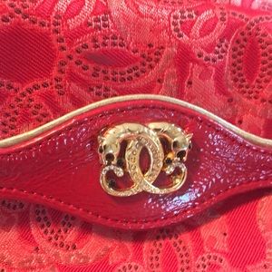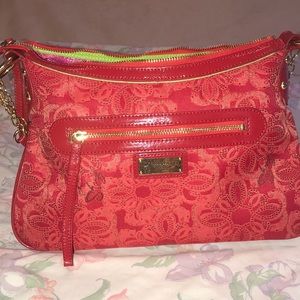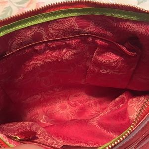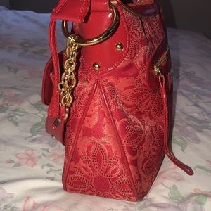 Beautiful unused practically new without tags. Trim and strap is red patent leather - bag itself s a beautiful red/orange tapestry. Inside is pink w green trim by top zipper closure! It is a stunning bag!!