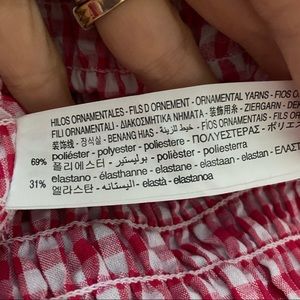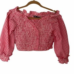 This is an adorable pink and white gingham stretchy crop top by Zara, sizes L and XL. New with tags. V-neck top with elbow length balloon sleeves. Smocked elastic detail and ruffled trim. Smoke free home. Retail: $35.90.