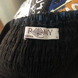 This is a beautiful Romy strapless dress. It is black with blueish/teal flower petal like pattern on it. At waist and bottom of dress there is black piping for accent. Dress has zipper on side. Dress is lightly used but in excellent condition with no stains or holes. Pictures are of actual item you will receive. Dress comes from a smoke free and pet free home.