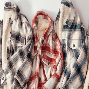 Chic and cozy plaid flannel shirt jacket. Rich dark teal color in a plaid pattern. Made of quality material that is soooo cozy. Inside lined with faux sherpa material in ivory. Front button closure. On trend oversized fit. Side pockets.