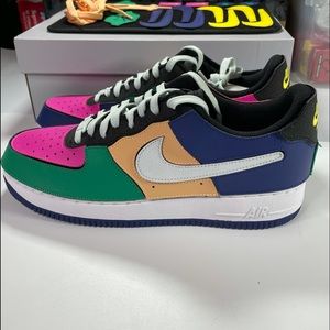 Nike Air Force 1/1 Mens Size 10 Shoes. These Sneakers are Velcro covered, and they come with several multicolor patches that can be changed on the shoe. I was talking about this tech just the other day. An old pair of KD 8’s had Velcro and patches that could be changed and I couldn’t think of any others. This one is very well put together with many colorful options. Check out the photo for details and contact me with questions.