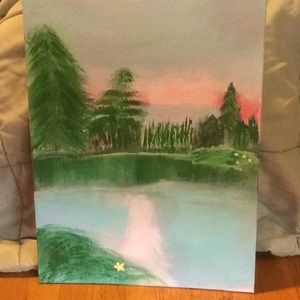 Our daughter Carolyn painted this 12x16 canvas . Lake side view . Wild fires in the distance . She is the great grand daughter of Clayton Darrow an artist back in the 1930’s from Connecticut , painting is unframed. 2020 a year we will never forget