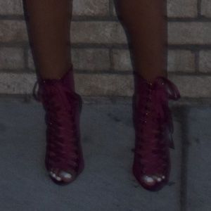 Wine corset suede lace-up bootie