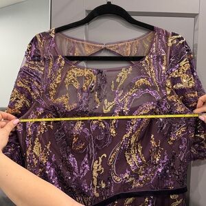 Beautifully embellished illusion gown with sparkling sequins, ethereal cape sleeves, and a defined waistline. Illusion neckline Cape sleeves Concealed back zipper Back neck clasp Self: Polyester Embroidery: Polyester/metallic Lining: Polyester Dry clean Imported SIZE & FIT About 62.5" from shoulder to hem Model