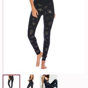 CELESTIAL GOLD FOIL CARA LEGGING Black The Cara Legging is our navy full-length active pant featuring a celestial print. The all-over moon, sun and star print make these pants one of a kind. Pair these leggings with the matching Bowie Top for a head to toe celestial look. Polyester/Spandex Blend Hand wash cold; lay flat to dry Made in the USA