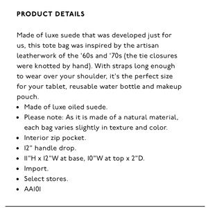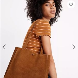 Madewell Elsewhere Suede Tote Bag NWOT. I am going to guess this is a bag sample when developing the Madewell Elsewhere Suede tote as the image grabs from the site. The dimensions and overall shape is different but you can see how it evolved to the final product.