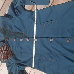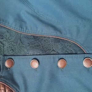 Features lace detailing on left side of chest and faux leather lattice on right shoulder