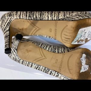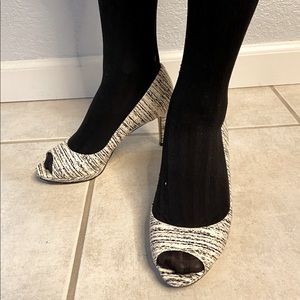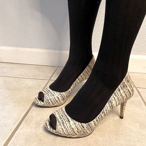 Enzo Angiolini Eagelabelle6 style - peep toe heels with modern black / off-white stripe design. It is adorable and had a modern feel.