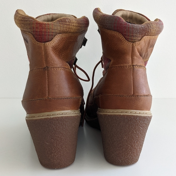 Two iconic brands, Pendleton and Timberland together for an updated classic wedge style boot, the Amston Hiker Wedges. These shoes are in good condition, but in the last two photos you can see two cuts that are visible to the surface of the leather. Some light scuffs from age.