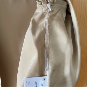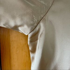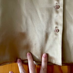 100% silk blouse in a beautiful, rich gold tone. Has signs of wear, as shown in photos. There are a few small spots on the front corner, discoloration around the armpits, and a small hole in the right armpit. I had a small tear in the left armpit repaired, and the seamstress had to undo the hem on the left side of the garment; thus, the lining of the hem on the left side is exposed. Has lots of life left, but would fit someone petite best, as the silk is very delicate. Has been dry cleaned.