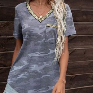Boho Grey Gold Sequin V neck Camo Top