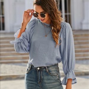 DUSTY BLUE SOLID KEYHOLE BACK FLOUNCE SLEEVE TOP