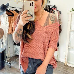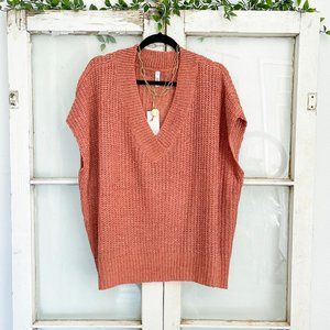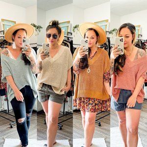 These Vneck Short Sleeve Sweater Vest are available in four colors: Aqua, Ginger, Tan, and Taupe. Oversized fit.