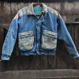 Awesome blue and grey 1980s jacket with cool pockets, zippers and flaps. The jacket has a thick cotton lining and will be snuggly for fall and winter. Nice, rigid denim that will last 100 more years. The tag says children’s size L, but would best fit a women’s XS, S or S petite. See measurements.