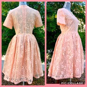 Cute as a CUPCAKE! This blush champagne PINK/peach VINTAGE dress is handmade & so ADORABLE! LACE overlay is in GREAT condition (no tears/holes), fabric underneath the lace appears to be a satin TAFFETA. Skirt includes a layer of TULLE. Zippered back closure, fit & flare FULL skirt, fitted bodice & short sleeves. PIN-Up & rockabilly style! AS-IS vintage condition. Minor flaws & some areas of discoloration (due to AGE & previous wear). Measurements FLAT: waist 14.5, bust 18, total length 38.5 in.