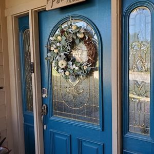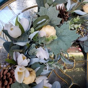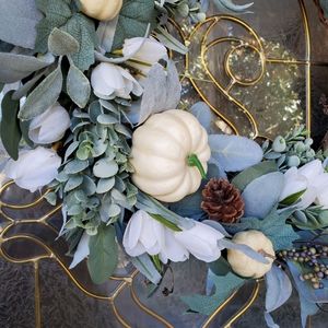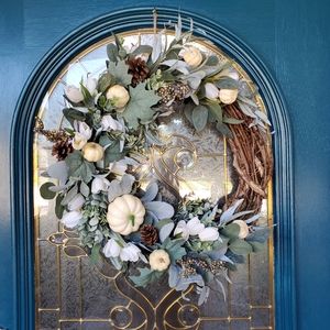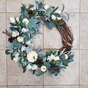 This grapevine wreath is covered in lamb's ear, pine cones, boxwood & ivy leaves. Popping out in shades of cream are little pumpkins and flowers. These pictures so not do it justice. This is for those that love a simple clean design for fall.