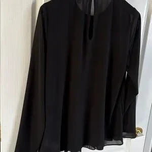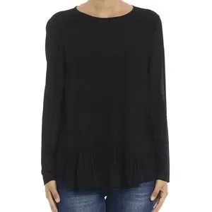 Elegant black blouse with long sleeves. Features a pleated design. Perfect for any occasion.