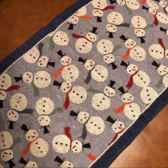 Complete your holiday table or mantle with this adorable runner! Dozens of happy snowmen ready for winter with their scarves flying in the breeze! Light blue tapestry base with white & navy border.