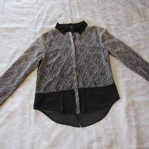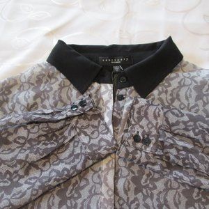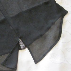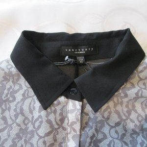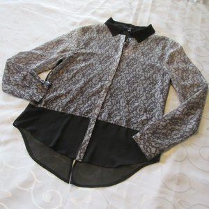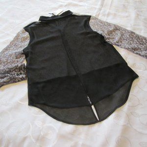 Full covered button down two toned sheer; taupe/beige print and black. Ombre shading, two button pleated cuff, and lower back slit. Dress up or down. Approximate measure: AP-to-AP 20 ½” flat, Sleeve 25”, Length: Collar to bottom hem 28 ½”. Will fit S/M depending on measure; ROOMY. SIZE XS NWT