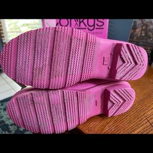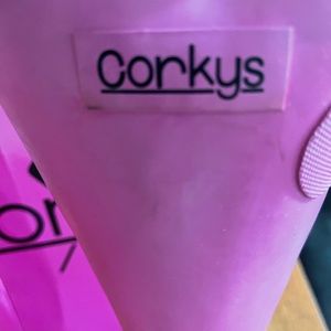Corkys rubber Tall rain boots in a beautiful Fuchsia color. The boots have the original box and Corkys logo tissue. These cuties are in good condition and will bring you years of looking cute splashing in the rain!