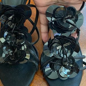 What sexiness these sandals bring! Made of black satin w/floral sequined accents. Fastens w/ ankle buckle. Minimal visible wear. All items from my smoke/pet free home and have been sanitized for next owner.