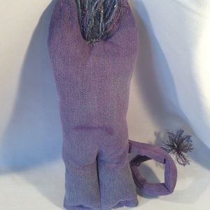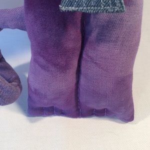 Cat is 12 inches tall. Made its recycled hand dyed blue jeans. Hand sewn. Curly tail with wire inside which allows shaping of tail. Tail and head accented with sparkle fibers. Cat is holding fish made out of recycled blue jean. Glass bead eyes. Hand embroidered mouth and nose. Filled with polyfill at top. Bottom of cat is filled by f