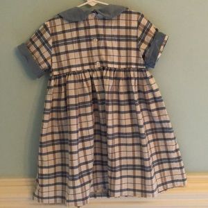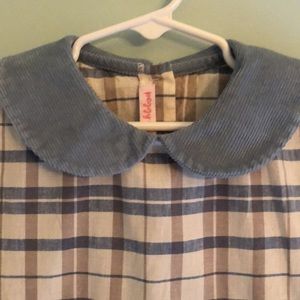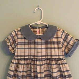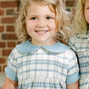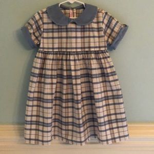 A great fall dress for your little! Linen cotton blend Peggy Green boutique dress, tan/beige/light blue plaid with a light blue scalloped corduroy neck and short sleeve trim, Size 5T worn once
