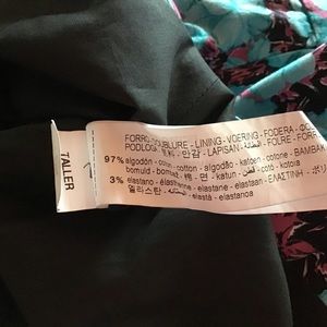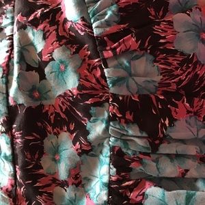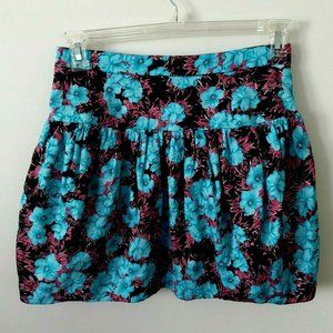 Hidden Side zip waist with slight stretch, fully lined, high waist, pink and blue floral print on black background. Gathered ruffle front, bubble hem NWT