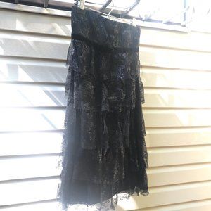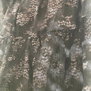Breathtaking black tiered ruffled lace cocktail dress with silver designs on the lace. Sheath style silhouette, and built-in black velvet ribbon going around under the bust with a bow in front. Strapless, has a zipper in the back. Fully lined. Perfect for special occasions!