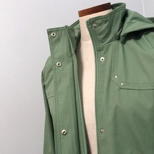 Super cute trench coat style rain coat. Beautiful pastel green color with silver detail. Has a good and pockets in front.