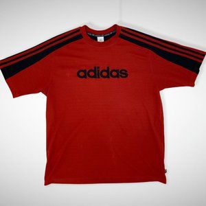 Adidas Vintage Spellout Red T-Shirt. Tag size: L men's. Fabric: Polyester. Condition: item has signs of wear (lint), no rips. Reduced price. Color: Red. SKU: ZZ11 Flat measurements Chest (armpit to armpit): 59cm, Length: 74cm all sales are final.
