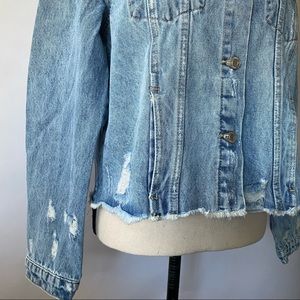 Vervet Denim// This Pocketed Distressed Denim Jacket gives your look a trendy edge. This essential denim jacket features a medium/light wash and a relaxed fit. A heavy distressing throughout and frayed hem elevates the look!