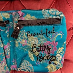 Blue Betty Boop Fanny Pack. Front zipper with Betty Boop writing, front zipper with Betty Boop decal. Main big zipper. Has a little bit of snagging on the front pocket but not noticeable when wearing it.