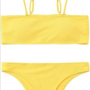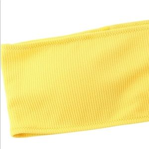 Bright Yellow bathing suit. Straight across top with padding and removable straps. Would not fit my C Cup, as fabric is not stretchy. Just tried on, never been used, but I did remove the tags