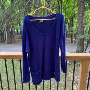 Mid thigh volcom sweater. Two pockets in the front, and a deep blue. Very cute, just don’t need it anymore.
