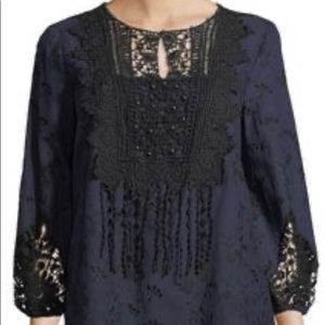 NWT T TAHARI Dress is a stunner. Fully lined, 100% Cotton, it’s embroidered all throughout the entire dress with added gorgeous Lace Details at the front, on the sleeves and at the hem. Tiny Silver balls are sewn into the lace front. My photos do not do this dress justice; must see in person to appreciate all the details. Dress is a dark Navy Blue w/ Black embroidery, a *WOW* combination! SZ M